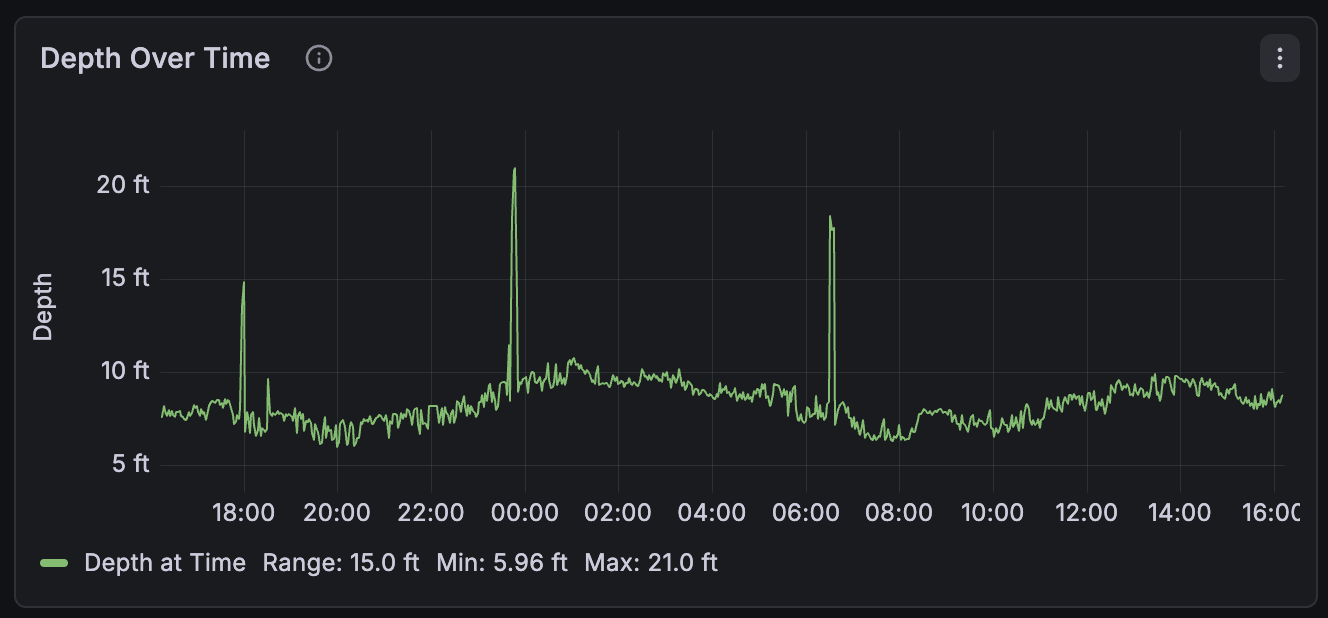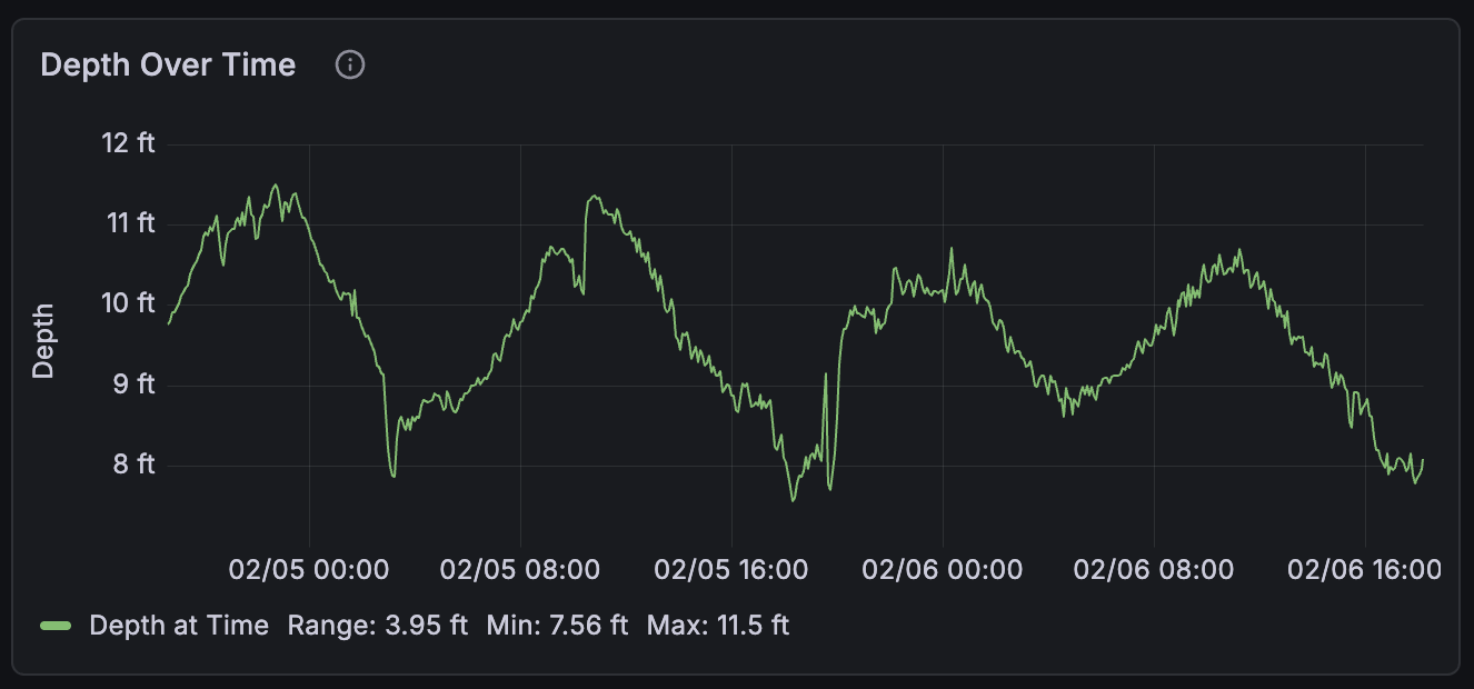 Initially, I used a basic query to pull the raw depth (note the conversion from meters to feet on Line 6) over a period of time. Note that v.timeRangeStart corresponds to the time range on the Grafana dashboard.