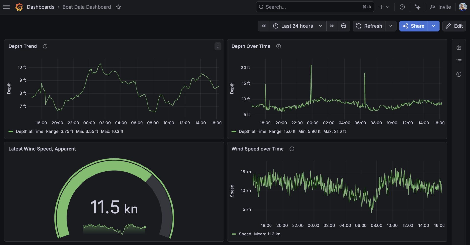 As a result of solving the tide station issue, our Grafana dashboard is slowly becoming a more comprehensive onshore monitoring tool. As long as the Starlink is up (or we have cell signal) and the instruments are on (our N2k network is on a separate breaker from our chartplotter), we can see exactly what Loka is feeling from anywhere in the world.